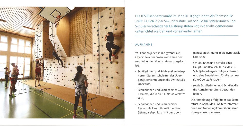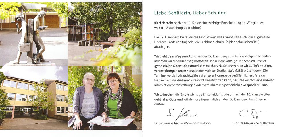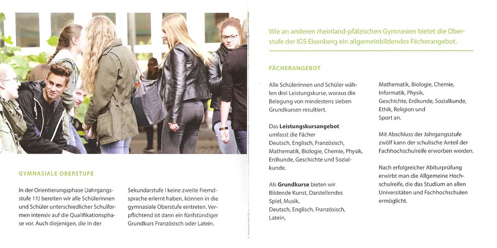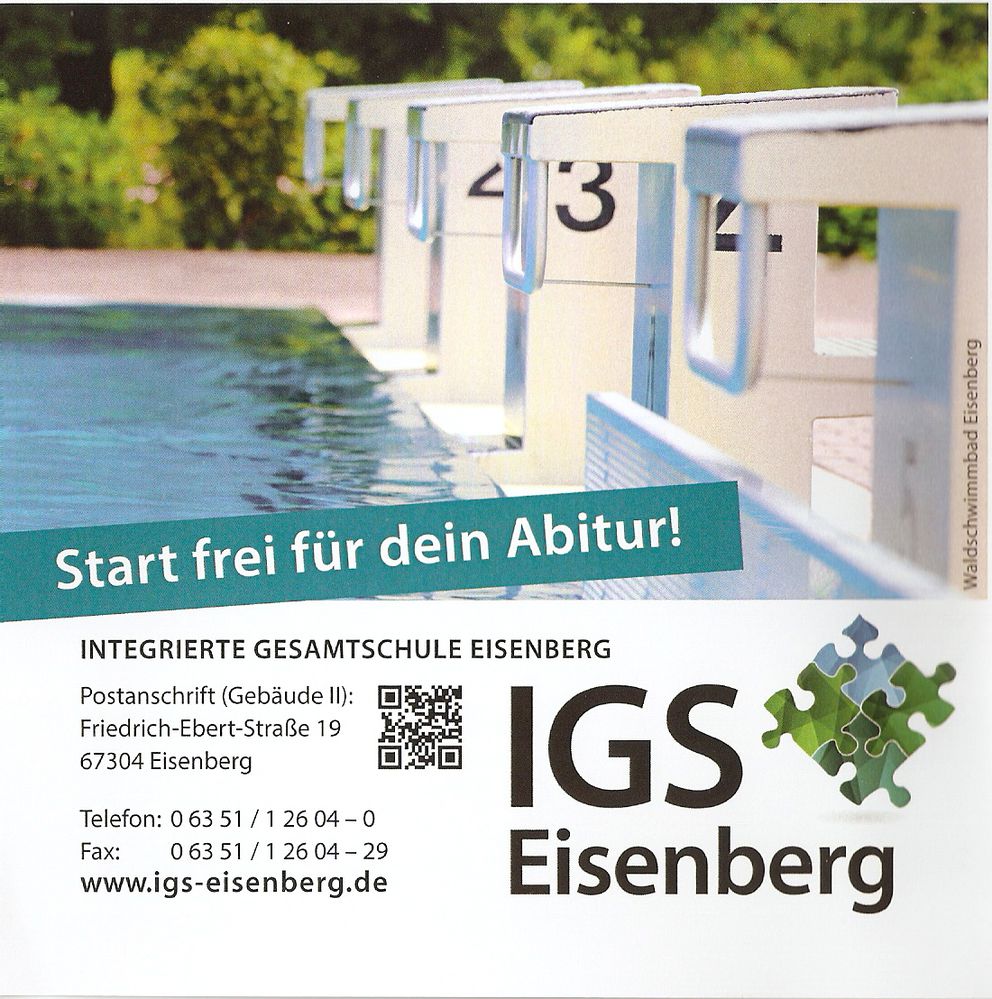 Mit dem Schuljahr 2016/17 erfolgt an der Integrierten Gesamtschule Eisenberg die Einführung der gymnasialen Oberstufe. In einer öffentlichen Veranstaltung des SPD-Gemeindeverbandes informierten die Schulleiterin der IGS Eisenberg Christa Mayer und die Koordinatorinnen Dr. Sabine Gellrich und Gabriele Steurer über die IGS und die Oberstufe unter dem Thema „Der Weg zum Abitur an der IGS Eisenberg“. Sie konnten ein überzeugendes, sorgfältig erarbeitetes Konzept für die gymnasiale Oberstufe vorstellen. An der IGS Eisenberg erhalten die Schülerinnen und Schüler von der 5. Klasse bis zum Abitur eine ausgezeichnete Schulbildung. Sie werden durch vielfältige Fördermaßnahmen gut auf alle Abschlüsse und somit auch auf das Abitur vorbereitet. Die Besucherinnen und Besucher der Informationsveranstaltung waren beeindruckt vom schulichen Angebot an der IGS Eisenberg. Eine übersichtlich gestaltete, handliche Informationsbroschüre zur gymnasialen Oberstufe kann angefordert werden bei: Integrierte Gesamtschule Eisenberg, Friedrich-Ebert-Str. 19, 67304 Eisenberg, Telefon 06351 12604-0, Fax 06351 12604-29, www.igs-eisenberg.de.