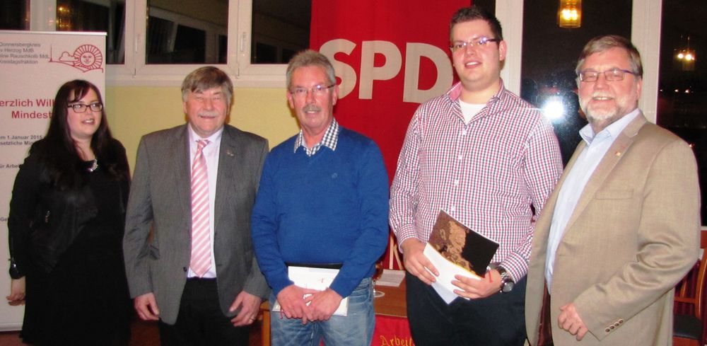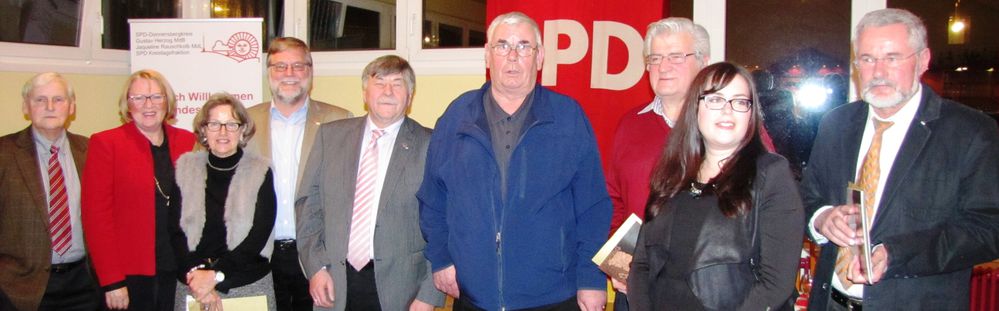 Jubilarenehrung des Ortsvereins, in Klammern die Jahre der SPD-Mitgliedschaft. Von links nach rechts: MdL Jaqueline Rauschkolb, Angelika Piégsa (30), Sven Heise (25), Hans-Werner Dech (35), Karl-Heinz Schreiner (45), Erika Schwehm (40), MdB Gustav Herzog, Vorsitzender Reinhard Wohnsiedler