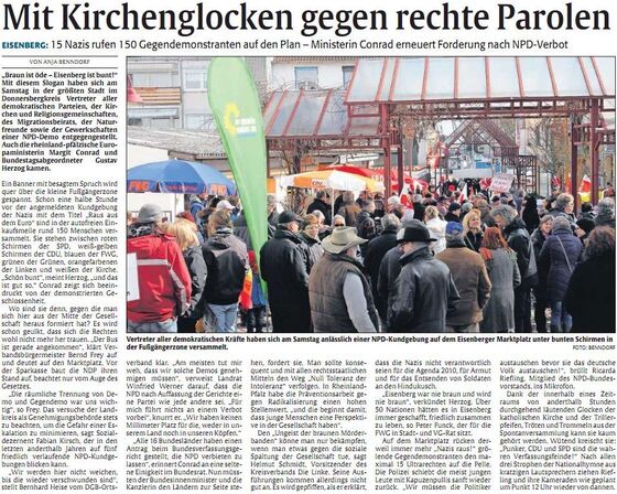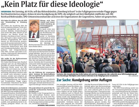 Für ein liebenswertes, tolerantes und weltoffenes Eisenberg gegen die Kundgebung der NPD in Eisenberg hatten folgende Organisationen gemeinsam aufgerufen: Protestantische und katholische Kirchengemeinden, Islamischer Kulturverein, Beirat für Migration und Integration,